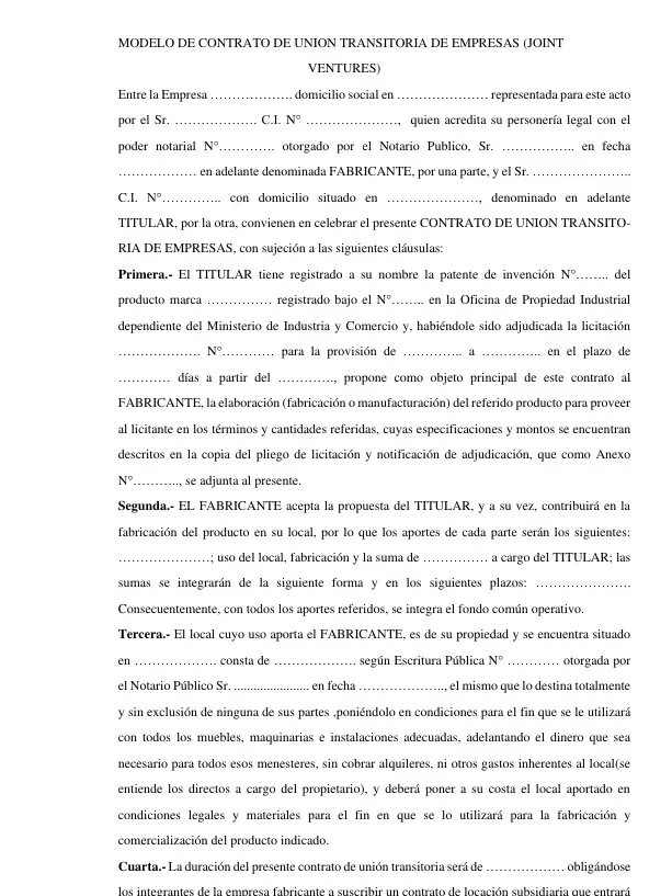 DESCARGAR MODELO DE CONTRATO DE UNION TRANSITORIA DE EMPRESAS (JOINT VENTURES) en WORD Descargar...